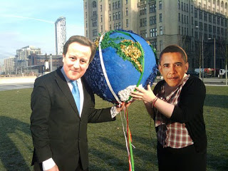 MARGJIN, a coalition of charities staged the picture of David Cameron and Barack Obama with the world in their hands in Liverpool.